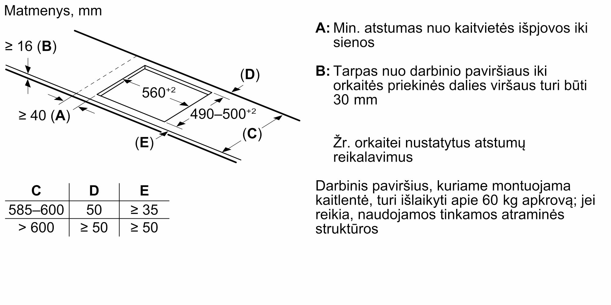 - Įrengti reikalingas angos dydis (A x P x G mm): 51 x 560 x (490–500)