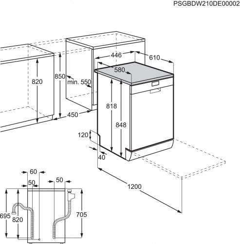 Įmontuoto A (min./maks.) × P × G (mm): 820/850 × 450 × 570